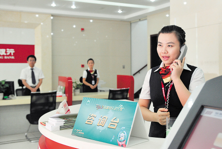 华融湘江银行的工作人员正在回答客户的金融业务问题。