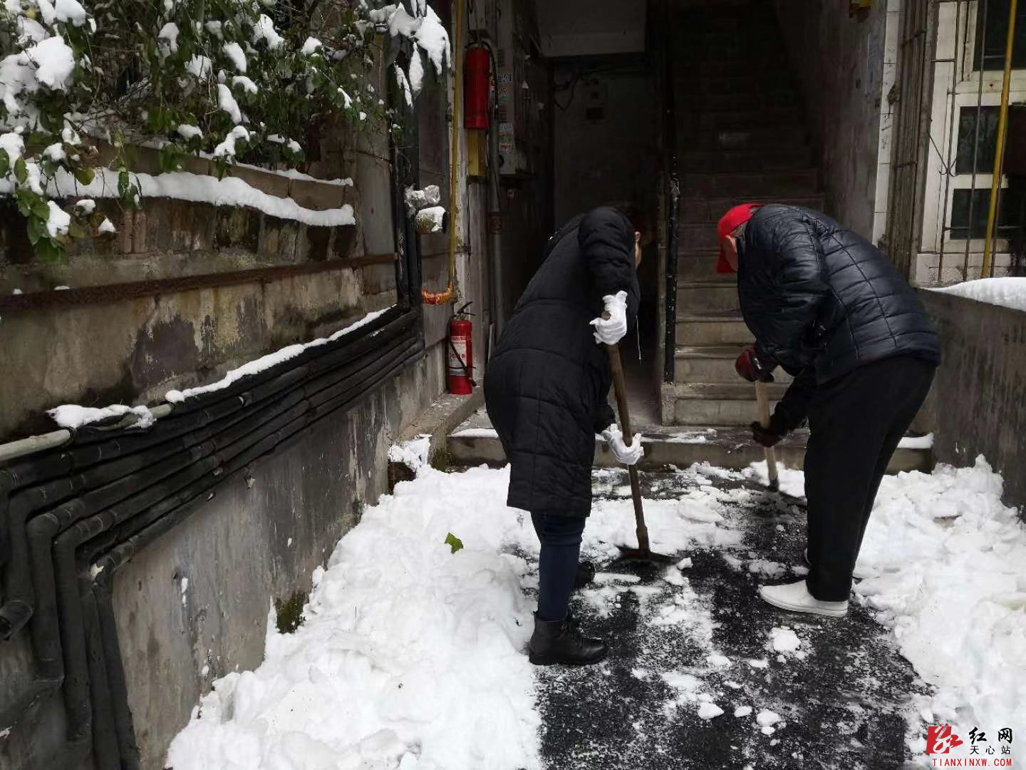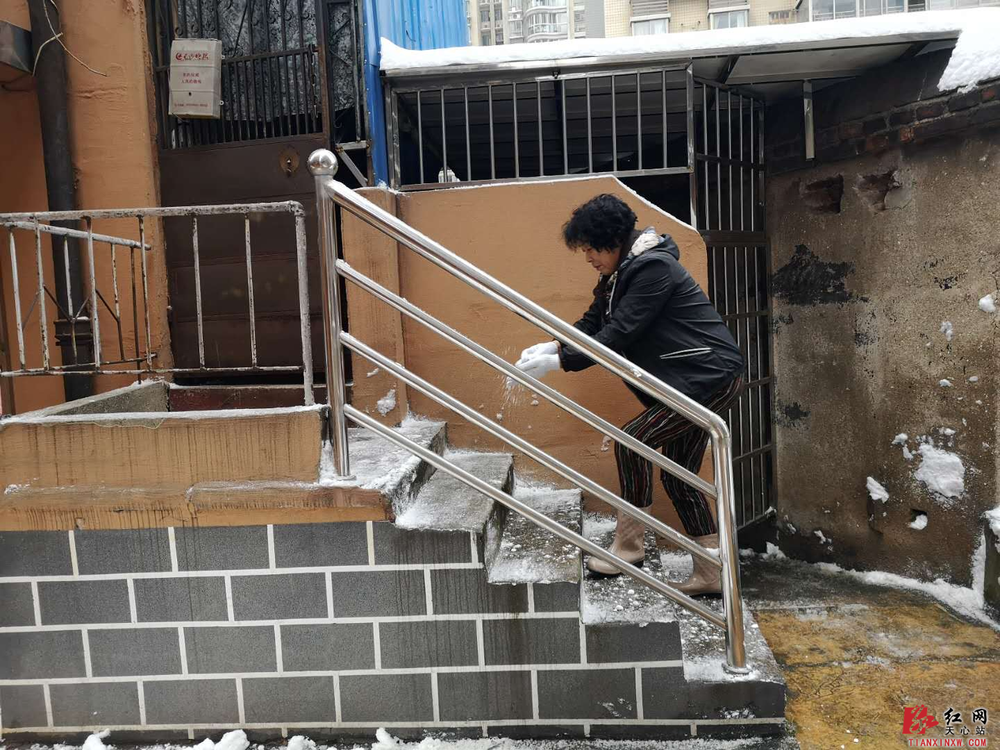 扫把塘9栋的居民张家民患有视障,她家门前有几级阶梯,社区书记张国庆担心她出行不便,清晨就带领志愿者到她家门口铲雪除冰,清理出一条通道,并在楼道上撒盐,防止雪水再次凝固,确保她的出行安全。