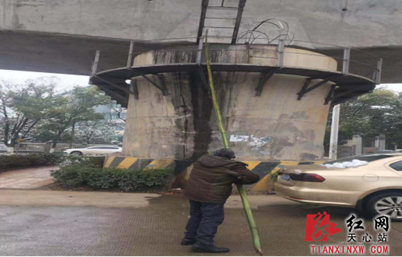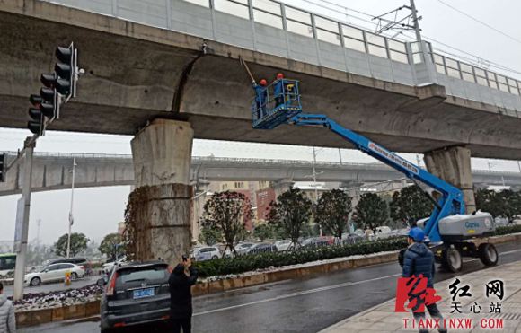位于先锋街道辖区内城际铁路先锋站及地铁1号线尚双塘站高架桥面由于白天雪水融化渗透,至夜间形成长短不一的悬垂冰锥,最长的超过80厘米,就像一把高悬在头顶的“利剑”,为防止白天气温升高冰锥脱落,对过往车辆及群众造成安全隐患,1月2日,先锋街道城管办调来高空作业车进行除冰作业。城管工作人员先用警戒线围合施工现场,再安排人员引导车辆和行人注意避让,对于矮处的冰锥处理起来比较容易,拿着竹竿轻轻一打就掉了。但是位于芙蓉南路城际铁路先锋站几乎每个桥体出水口都挂满了冰锥。桥梁高度约有25米,桥下交通流量很大,冰锥随时可能坠落。作业人员就必须登上高空作业车的撑臂,来到十层楼房高的半空中,再用竹竿将冰锥敲碎,为防止碎冰影响路面交通,最后城管工作人员将碎冰清扫装车。经过一天的努力,累计铲除冰锥100余处,一一排除芙蓉南路沿线高架桥冰锥坠落险情。