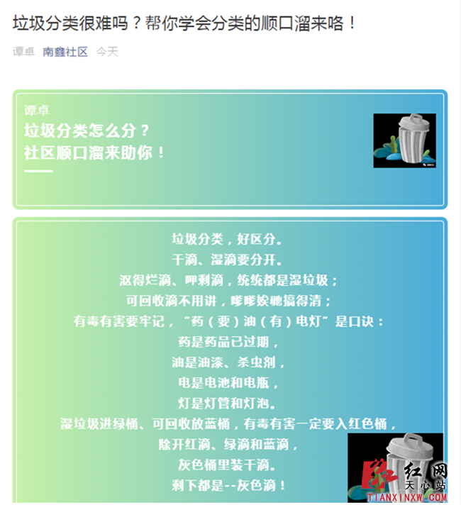 8月份的长沙“炎值”已爆表,高温的背后不乏垃圾分类专干日益高涨的工作热情。8月20日,天心区南托街道南鑫社区的工作人员为了让居民更通俗易懂地了解生活垃圾究竟应该怎样分类,通过平时的工作积累,巧妙地整理出一段长沙话顺口溜,通过微信链接等方式,用方言直白、简单地告诉居民朋友垃圾分类不是“难题”。