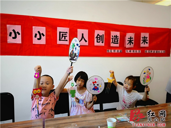 “叮叮当当!叮叮当当!”听,五彩扇子扇动风铃的悦耳声音传来。9月3日上午,桂花坪街道九峰苑社区绿地名邸小区邻里党群服务中心来了一群可爱的“小小匠人”们,在桂花坪街道社工站的社工们的带领下,大家一起动手DIY,一个个漂亮的风铃和色彩鲜艳的扇子出现在大家眼前。