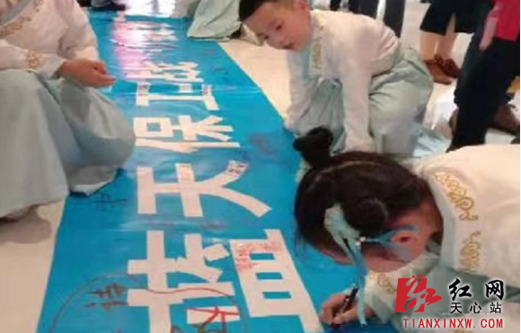 萌娃在保卫蓝天横幅上签下自己的承诺。