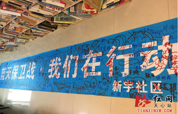 文艺汇演活动现场,由新宇社区“新宇之声”“新宇之秀”团队带来的歌舞表演更是贴合“蓝天保卫战”我带头、“垃圾分类”我先行、“居民生活”我快乐的主题,演绎着人民对美好生活的向往;台下萌娃们在“蓝天保卫战 我们在行动”的横幅上签下了自己的承诺。优美的舞蹈、优秀的绘画作品展、激情澎湃的倡议,同时穿插着社区工作人员的宣传讲解,多种形式让现场气氛热闹非凡。