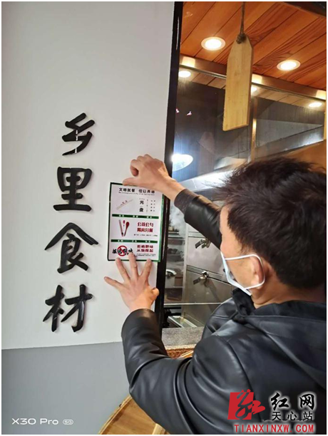 社区工作人员为餐饮门店张贴“公筷公勺”宣传单